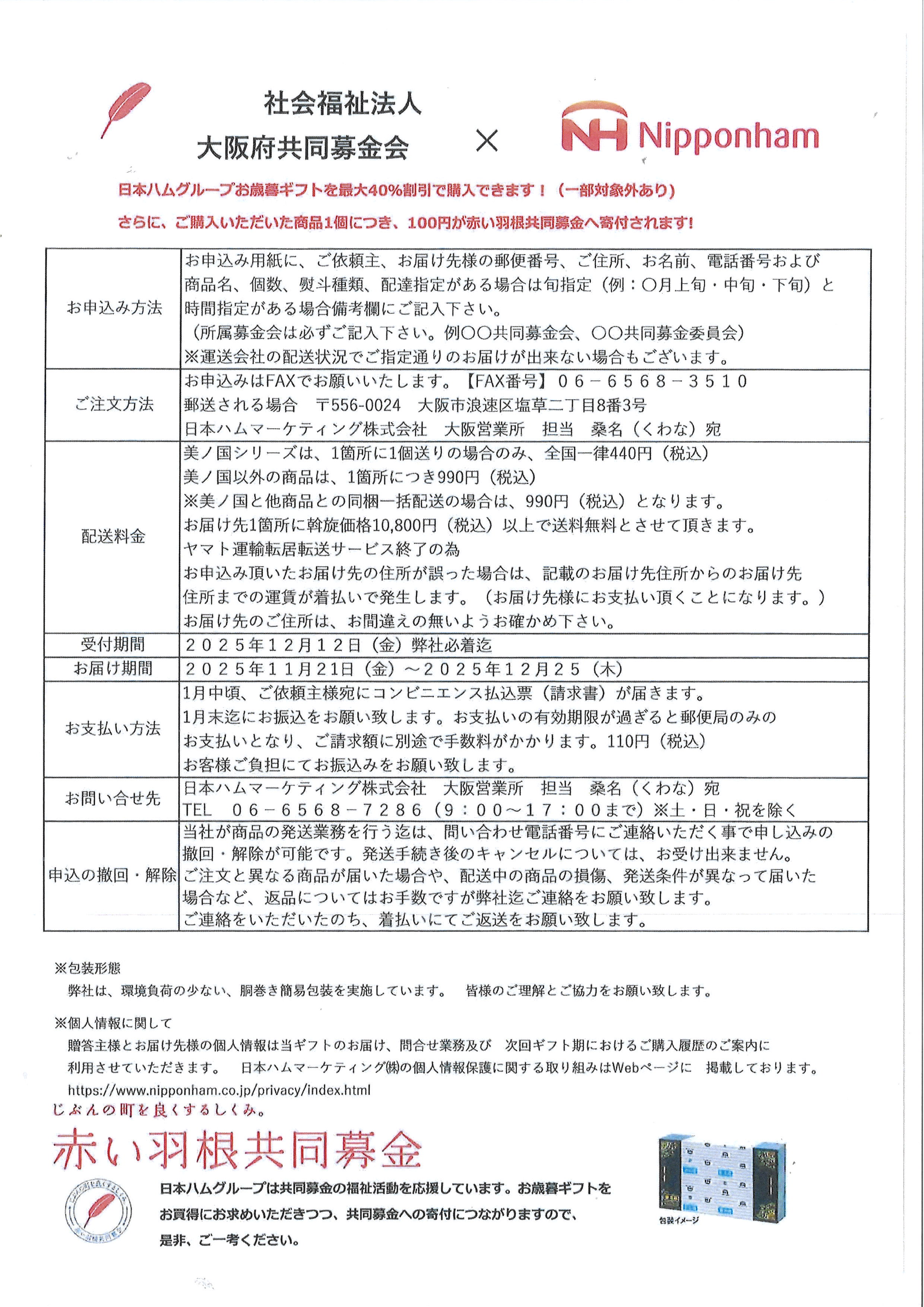 皆様に購入いただいた商品1個につき100円が赤い羽根共同募金に寄付されます。